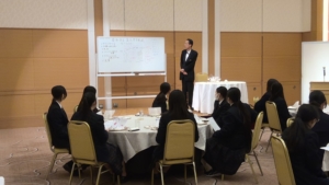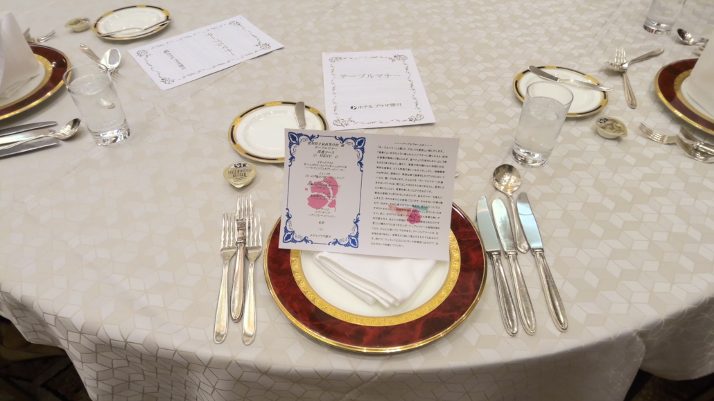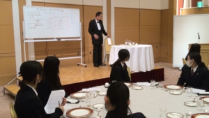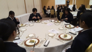 生活文化科3年生全員で、マナー講習会に参加してきました。会場は勝川駅前にあるホテルプラザ勝川です。講師の先生がカトラリーの説明やナプキンの使い方など、食事中のマナーについて丁寧に教えてくださいました。最初は生徒全員が緊張のあまり会場全体が静まりかえっていましたが、講師の先生からマナーを守りながらも、会話を楽しんで食事をすることの大切さを教わり、デザートをいただく頃には、各テーブルで会話もはずみ楽しい時間を過ごすことができました。2月の「卒業おもてなしフルコース実習」では、お世話になった保護者に向けて生徒が調理と給仕をします。今日のマナー講習会での学びを生かして成功させたいです。ホテルプラザ勝川の皆様、ご協力ありがとうございました。