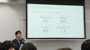 16回目の授業は、マーケティングの授業を受けました。今回もマルト水谷さんがお越しくださり、マーケティングの基本となる考え方について教えていただきました。「マーケティングとは何か」から始まり、「STP」や「SWOT分析」について学習しました。企業がどのように市場を分析し、戦略を決めているかを知ることができました。