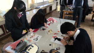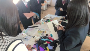 1月16日生活文化科1年生「ファッション造形基礎」の授業にて、明美文化服装専門学校より講師の磯村先生と田上先生をお招きし「デザイン画コラージュ体験」を行いました。たくさんの生地から自分の好きなものを選び、自由にデザインを形にする活動はいくら時間があっても足りないほど皆が夢中になりました。最後に作品について先生にご講評もいただくことができ、経験を今後に生かしていきたいと思います。