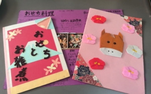1年生生活文化科の生徒が冬休み課題として取り組んだ「おせちレポート」。手書きのイラスト、写真、画用紙、折り紙、フェルトなどを自由に使い、おせち料理についてまとめました。職員室前に展示し、たくさんの先生方、生徒のみなさんにも見ていただくことができました。