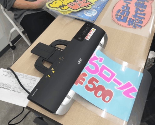 雨予報だったので自分たちで作ったPOPにラミネートをしました。